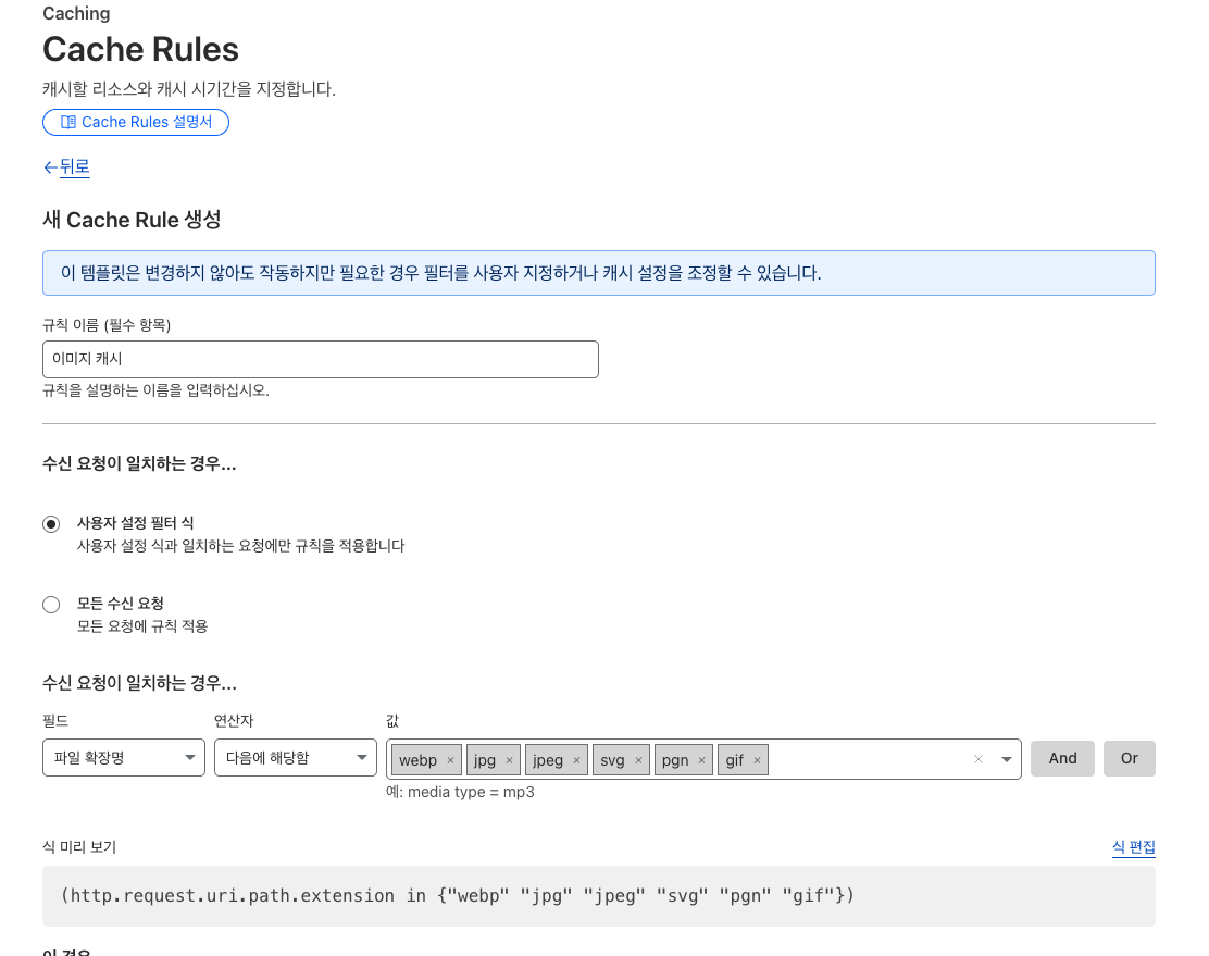 도메인 -> cache ->caching rules로 내 페이지에서 다루고 있는 이미지 관련 확장자만 추가해줬다.